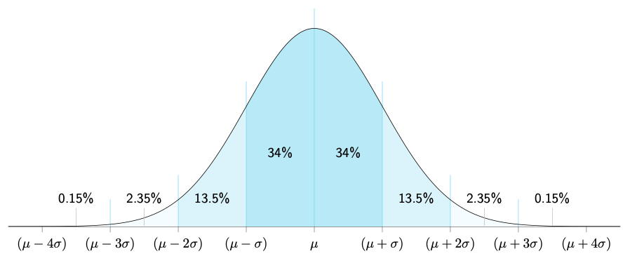 • 2 Standard Deviations: Go out a bit further, and you capture 95% of all outcomes.